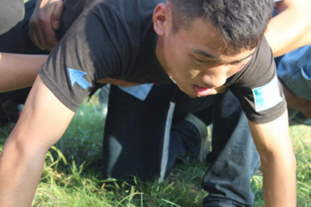 在抱團打天下項目中,全體隊員需要通過協(xié)調(diào)合作以最快的速度全員通過懸在空中的繩子,其間,身體不能與繩子產(chǎn)生接觸。幾經(jīng)嘗試,觸碰繩子的懲罰不斷累加,直至增加到需做120個俯臥撐。盡管任務艱巨,但隊員們咬牙堅持、克服難關。